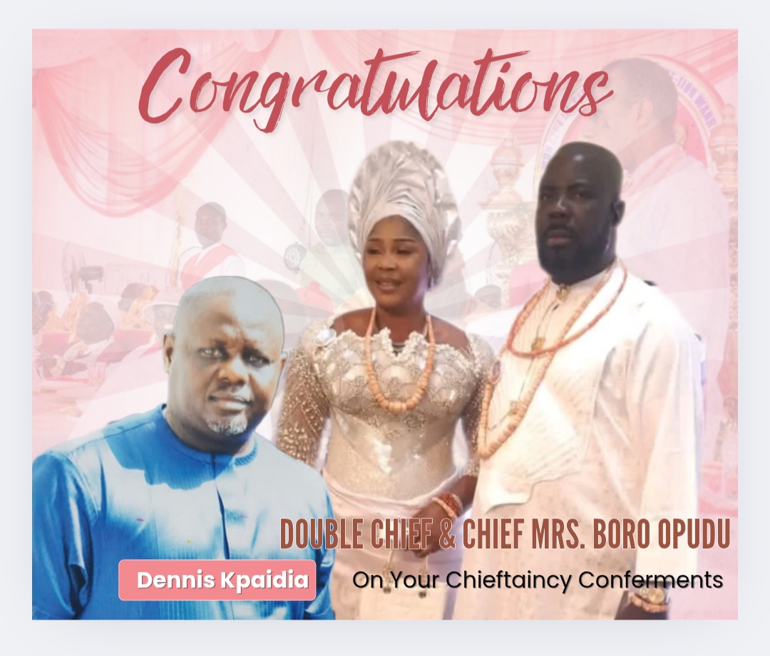Warri – Niger Delta youth leader, Dennis Kpaidia, has congratulated Double Chief Boro Opudu, Chairman of the Delta State Waterways and Land Security Committee, and his wife, Chief Mrs. Boro Opudu, on their recent Chieftaincy conferments.