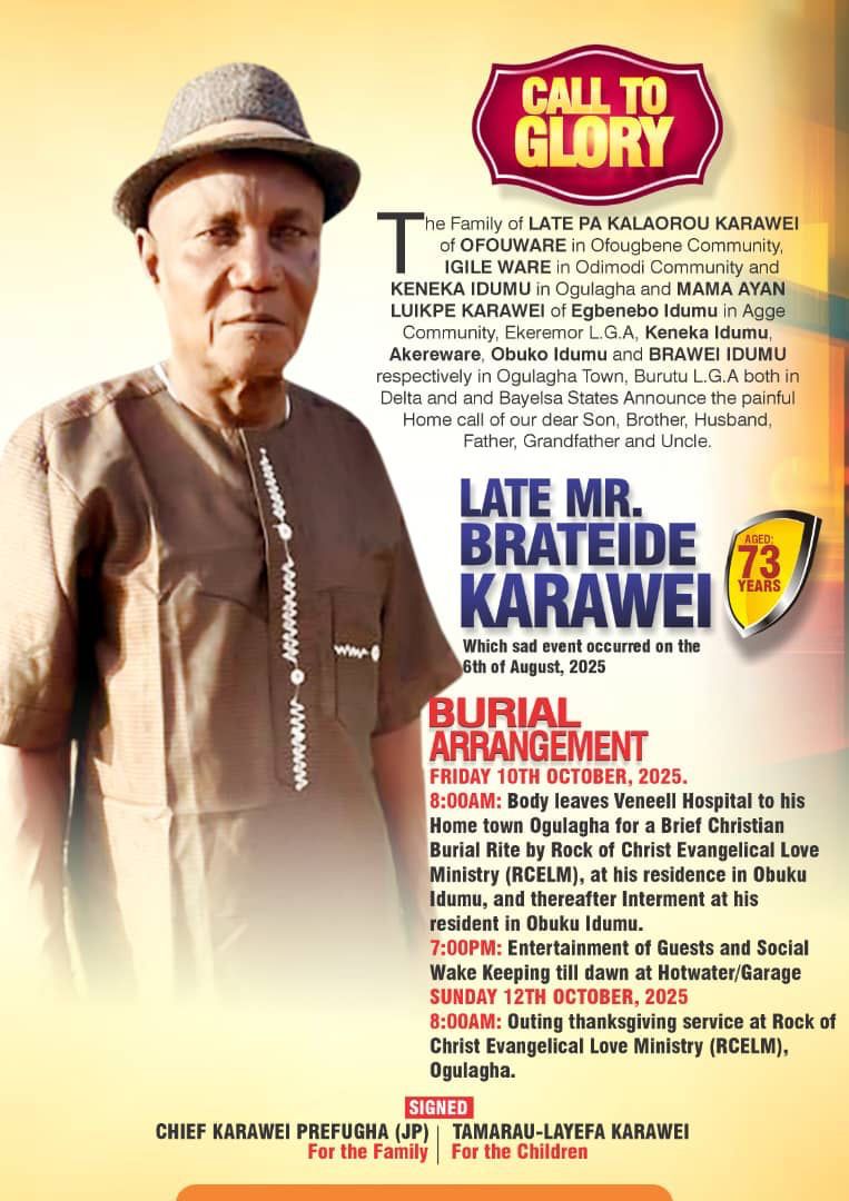 The Karawei family of Ogulagha Community in Burutu Local Government Area of Delta State has announced the burial arrangements for remains of Late Mr. Brateide Karavei, who died on August 6, 2025,at the age of 73.