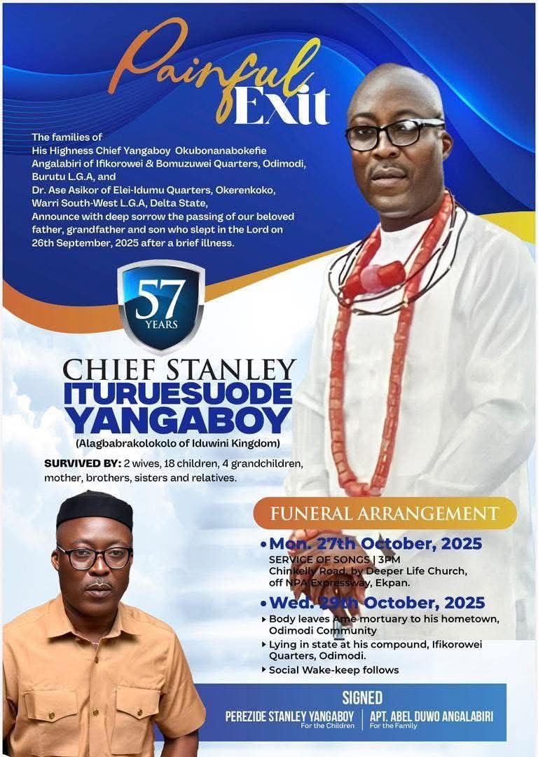 The Yangaboy Angalabiri family of Odimodi town in Iduwini Kingdom and Dr. Ase Asikor family of Okerenkoko town in Gbaramatu Kingdom appreciates Ijaw nation, Deltans, and all well-wishers over their tremendous support before, and during the burial ceremony of their grandfather, father, uncle, brother, and son, Late Chief Stanley Ituresuode Yangaboy, (Alagbabrakolokolo of Grand Iduwini Kingdom).