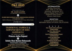 According to the official invitation, the Traditional Marriage Ceremony is scheduled to hold on Wednesday, November 26th, 2025, at Mr. Julius Ilajawei’s compound in Ogulagha. This is expected to attract family members, friends, community leaders, and dignitaries from within and outside the Niger Delta.