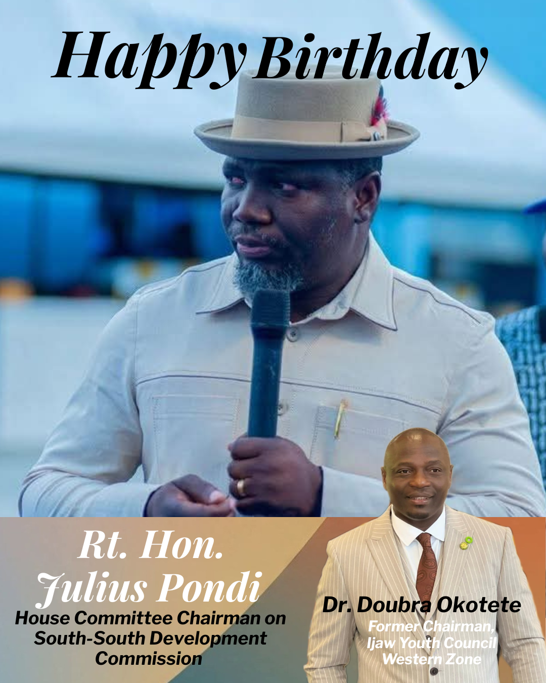 Niger Delta youth leader, Dr. Doubra Colins Okotete has extended warm birthday felicitations to the Member Representing Burutu Federal Constituency and the Chairman, House Committee on the South-South Development Commission, Rt. Hon. Julius Gbabozor Pondi.