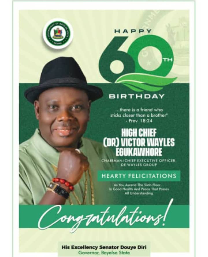 The Governor of Bayelsa State, , has extended warm felicitations to , Chairman and Chief Executive Officer of De Wayles Group, on the occasion of his 60th birthday.