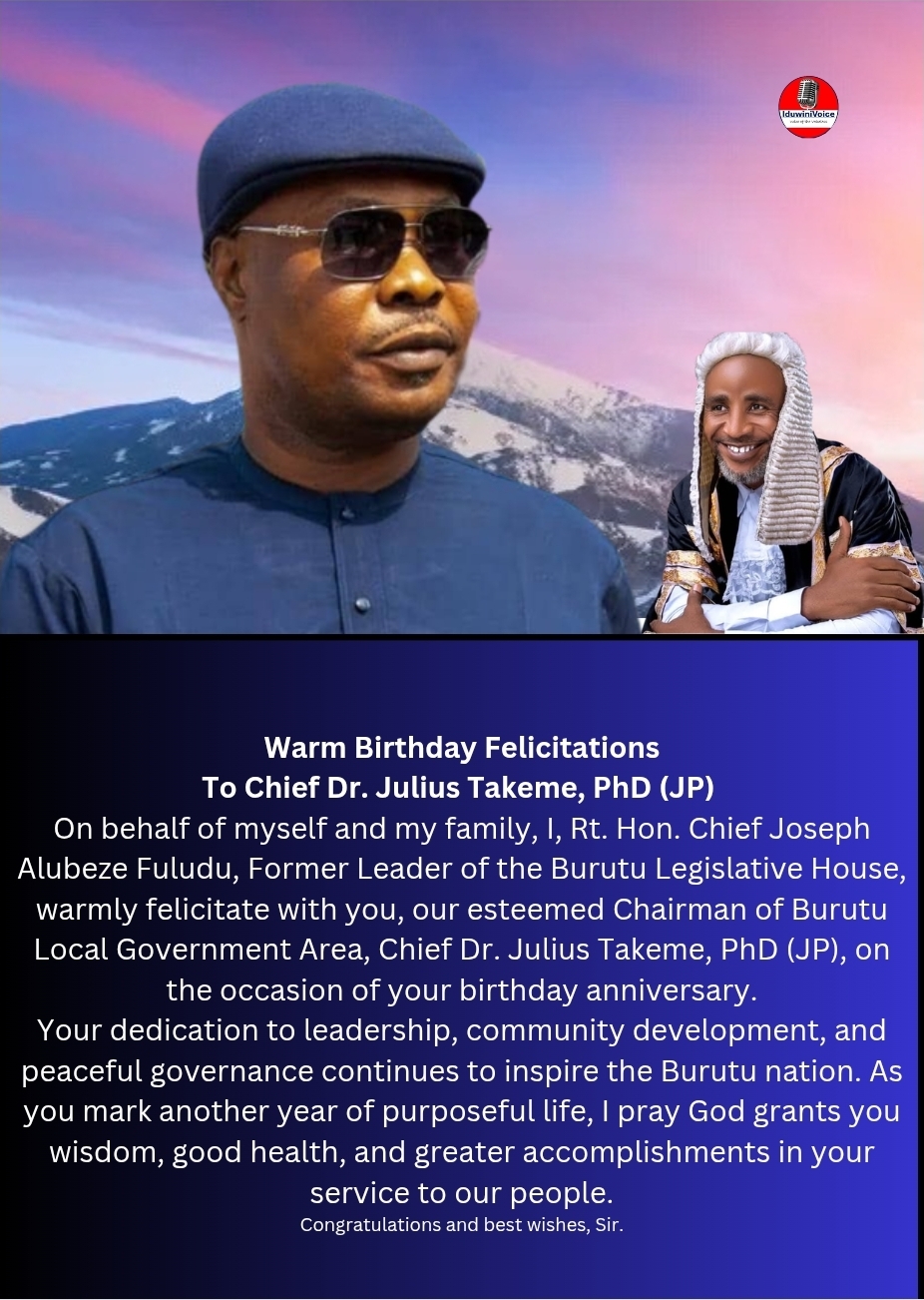 In his congratulatory note, Chief Fuludu stated: “On behalf of myself and my family, I, Rt. Hon. Chief Joseph Alubeze Fuludu, Former Leader of the Burutu Legislative House, warmly felicitate with you, our esteemed Chairman of Burutu Local Government Area, Chief Dr. Julius Takeme, PhD (JP), on the occasion of your birthday anniversary.”