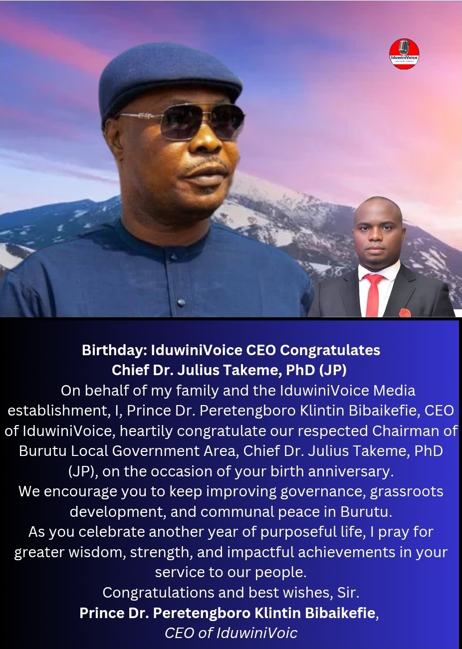 Prince Bibaikefie wrote: “On behalf of my family and the IduwiniVoice Media establishment, I, Prince Dr. Peretengboro Klintin Bibaikefie, CEO of IduwiniVoice, heartily congratulate our respected Chairman of Burutu Local Government Area, Chief Dr. Julius Takeme, PhD (JP), on the occasion of your birthday anniversary.”