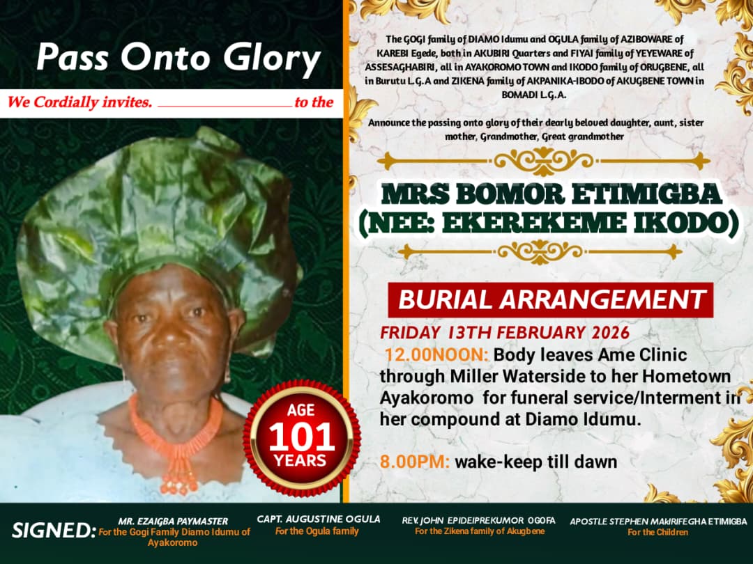 Chief Evans Etimigba JP (FICMC) has called onl family, friends, and well-wishers to the burial ceremony of his Grandmother, Mama Bomor Etimigba (née Ekerekeme Ikodo), billed to hold on February 13, 2026, at Ayakoromo Town, Burutu Local Government Area of Delta State.
