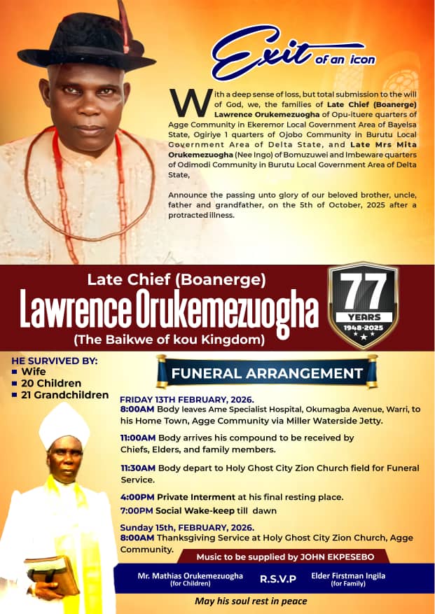 The burial of Late High Chief (Boanerge) Lawrence Orukemezuogha of Opu-Ituere quarters of Agge Community in Ekeremor Local Government Area of Bayelsa State, Ogiriye 1 quarters of Ojobo and Bomuzuwei and Imbeware quarters of Odimodi, both in Burutu Local Government Area of Delta State, who died at the age of 77 years (1948 – 2025) on the 5th of October, 2025, after a protracted illness, has been announced by family.