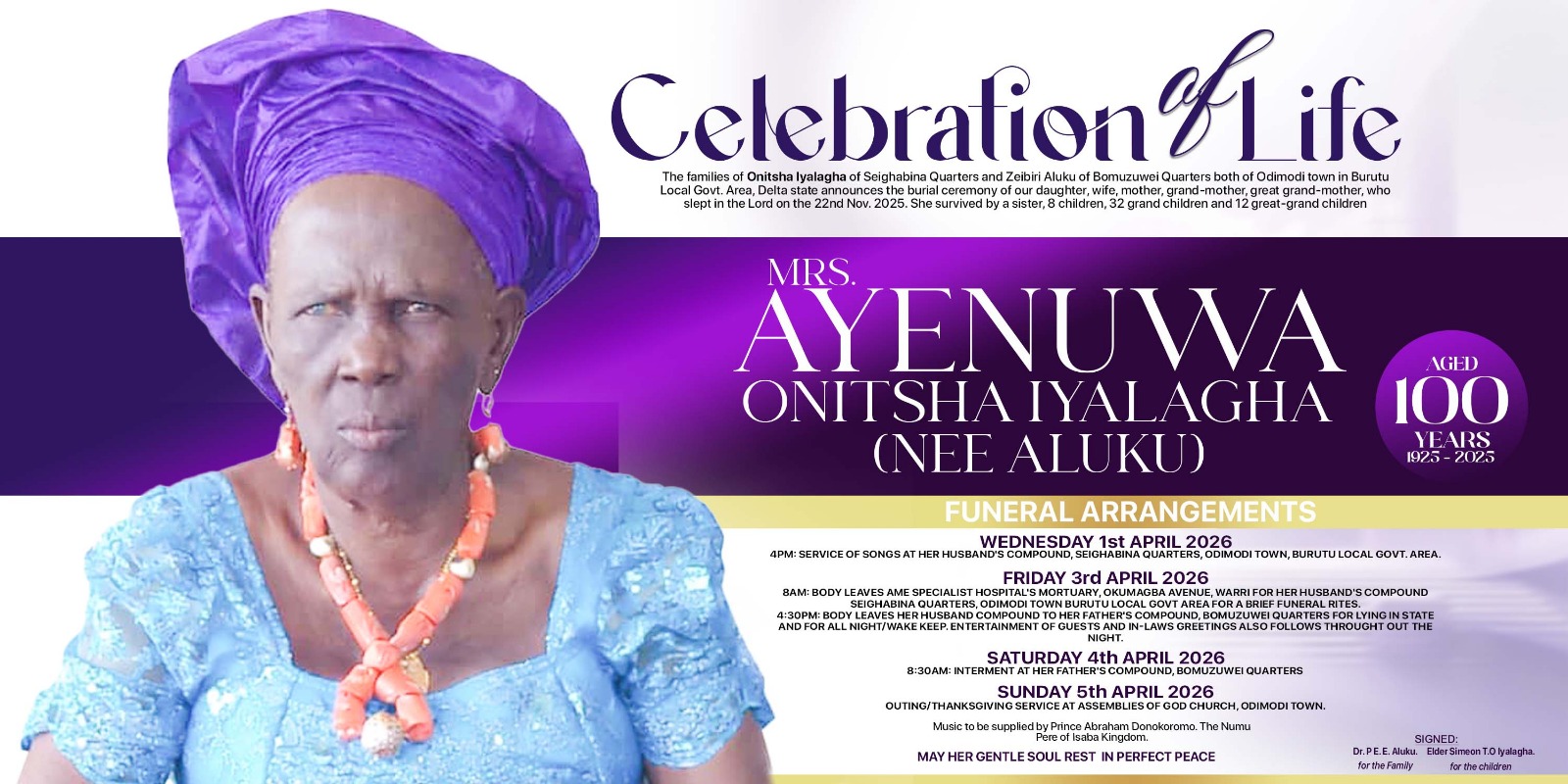The families of Onitsha Iyalagha of Seighabina Quarters and Zeibiri Aluku of Bomuzuwei Quarters in Odimodi Town, Burutu Local Government Area of Delta State, have announced the burial arrangements for their matriarch, Mrs. Ayenuwa Onitsha Iyalagha (Nee Aluku), who passed on at the age of 100.