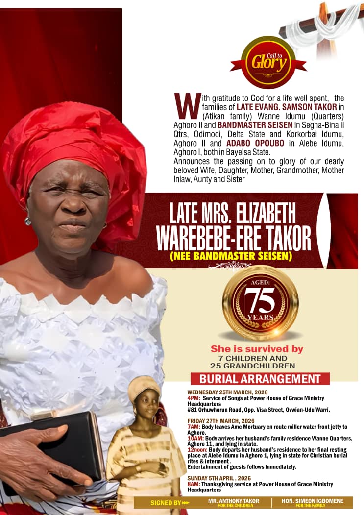 “With gratitude to God for a life well spent, the families of Late Evang. Samson Takor in (Atikan family) Wanne Idumu (Quarters) Aghoro II, in Ekeremor LGA of Bayelsa State, Bandmaster Seisen in Seighabina II Qtrs, Odimodi, in Burutu LGA of Delta State and Korkorobai Idumu, Aghoro II and Adabo Opoubo in Alebe Idumu, Aghoro I, both in Ekeremor LGA of Bayelsa State announce the passing on to glory of our dearly beloved wife, daughter, mother, grandmother, mother-in-law, aunty and sister, Late Mrs. Elizabeth Warebebe-Ere Takor (Nee Bandmaster Seisen), who passed on at the age of 75.