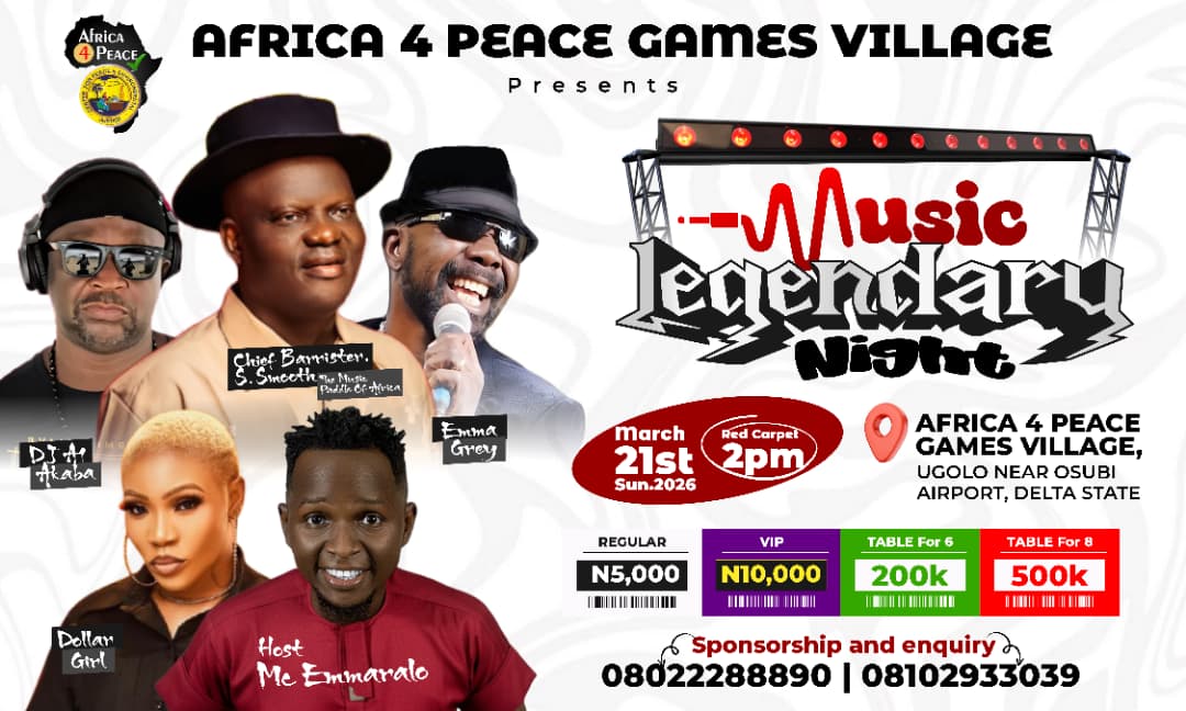 The famous and popular Africa 4 Peace Games-Village and event centre located at Ugolo near Osubi Airport, Okpe LGA hosting several sports, Lounge and children’s gardens is inviting all lovers of musical jams for healthy relaxation over the weekend.