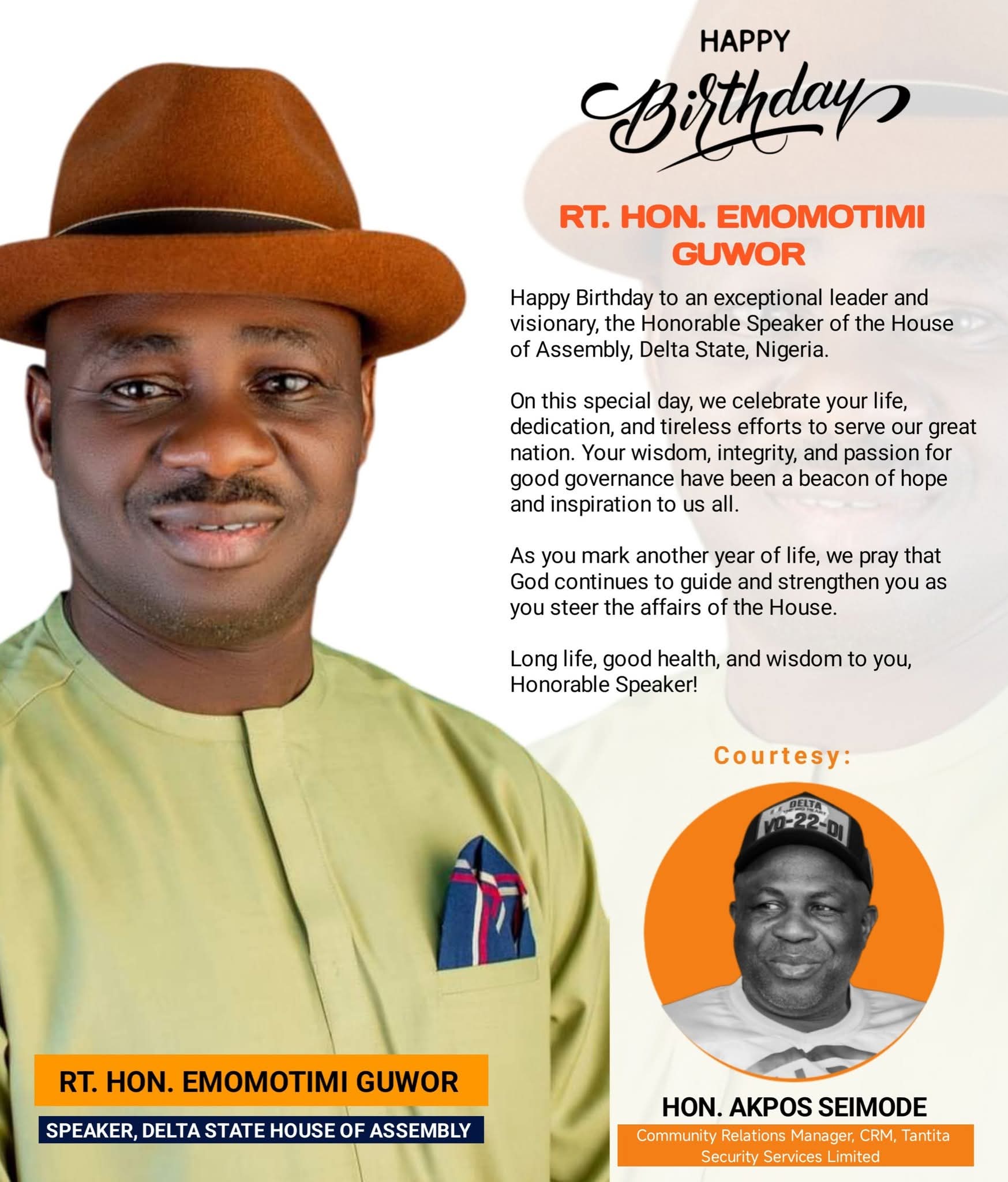 The Community Relations Manager of Tantita Security Services Limited, Hon. Akpos Seimode, has extended warm birthday felicitations to the Speaker of the Delta State House of Assembly, Rt. Hon. Emomotimi Guwor, on the occasion of his birth anniversary.