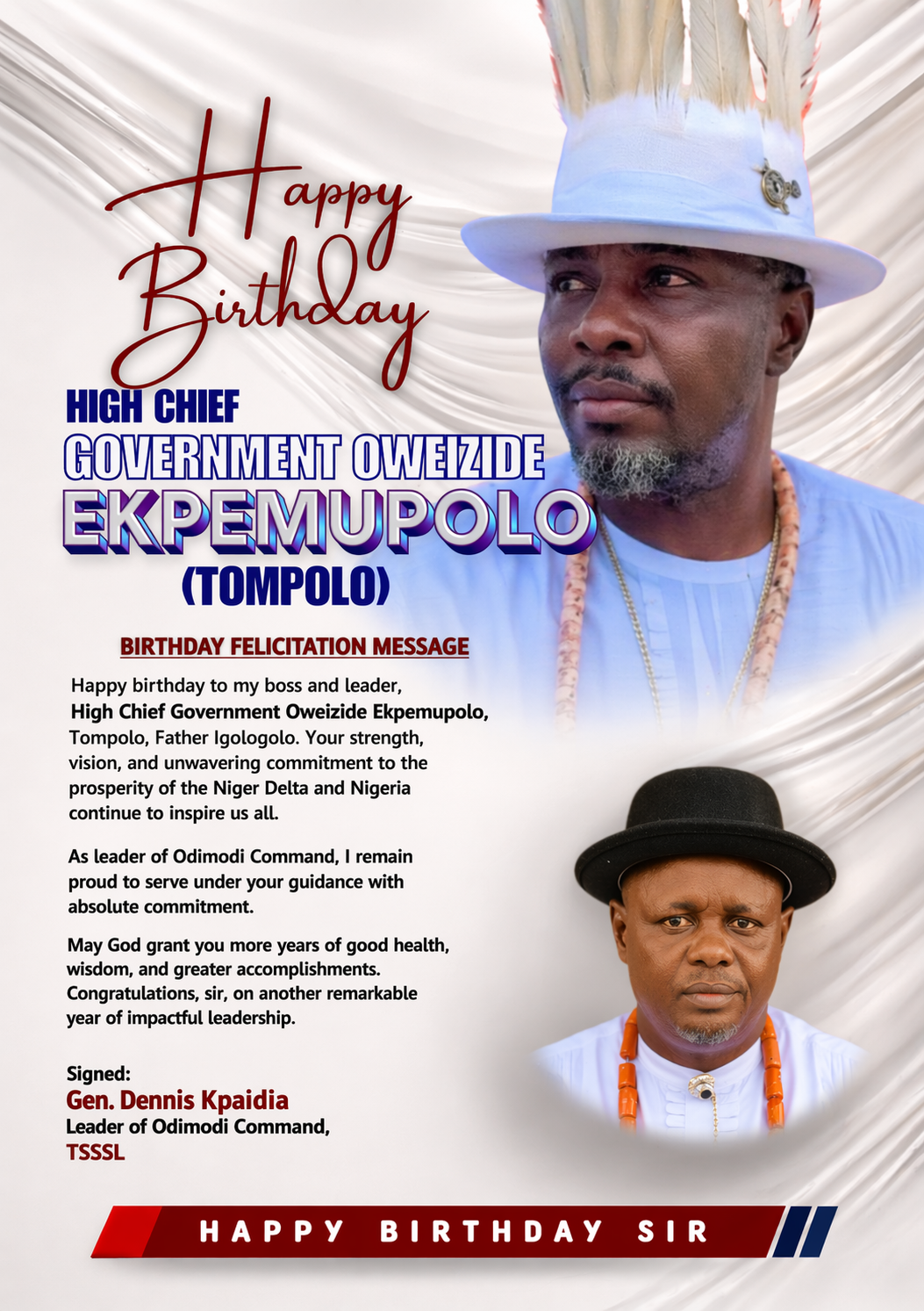 The Leader of Odimodi Command, Tantita Security Services Nigeria Limited, Gen. Dennis Kpaidia, has extended warm birthday felicitations to High Chief Government Oweizide Ekpemupolo, popularly known as Tompolo, describing him as an inspiring leader whose impact continues to resonate across the Niger Delta.