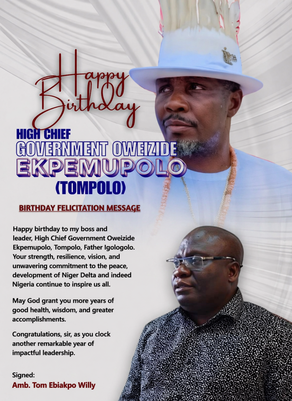 Ambassador Tom Ebiakpo Willy has extended warm birthday felicitations to High Chief Government Oweizide Ekpemupolo, popularly known as Tompolo, describing him as a great leader whose contributions to peace and development continue to inspire across the Niger Delta and Nigeria.