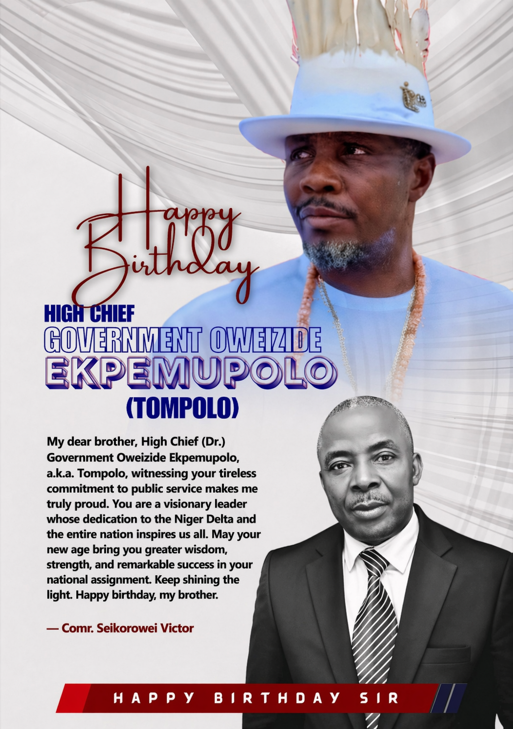 “I join family, friends, associates and well-wishers to extend warm felicitations to a great leader, mentor, community builder, philanthropist, a worthy son of the Niger Delta and the Ijaw nation, and a patriotic Nigerian, High Chief Government Oweizide Ekpemupolo, on the occasion of his 55th birthday.”