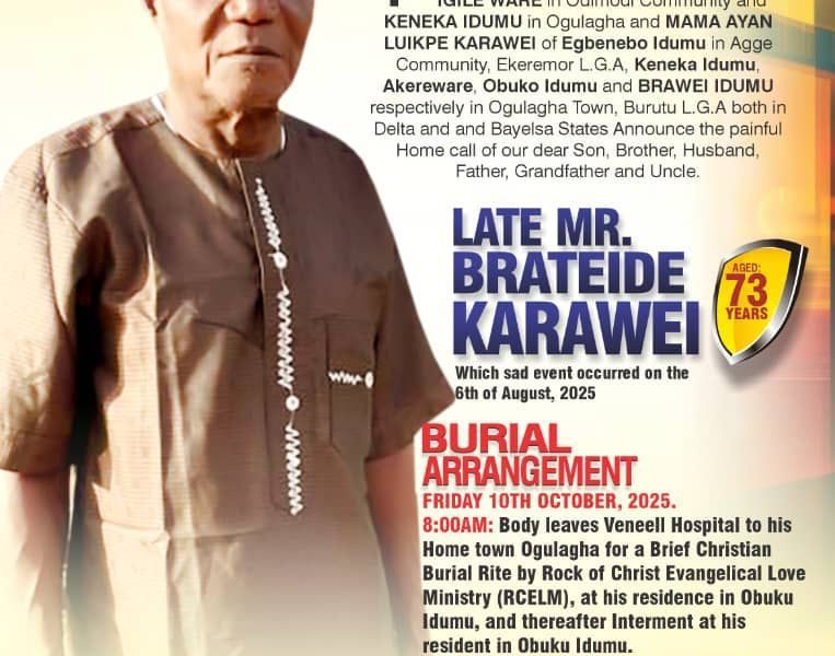 By: Favour Bibaikefie The Karawei family of Ogulagha Community in Burutu Local Government Area of Delta State has announced the burial arrangements for remains of Late...